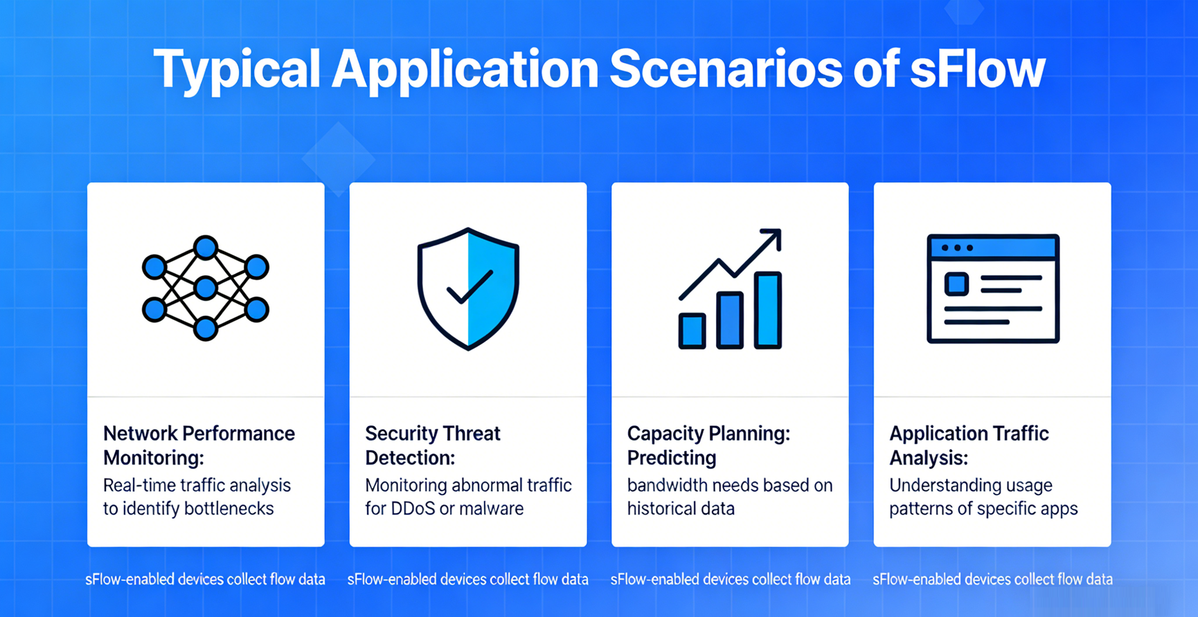 sFlow’s versatility makes it suitable for a wide range of network environments, from small enterprises to large data centers. Its most common application scenarios include: