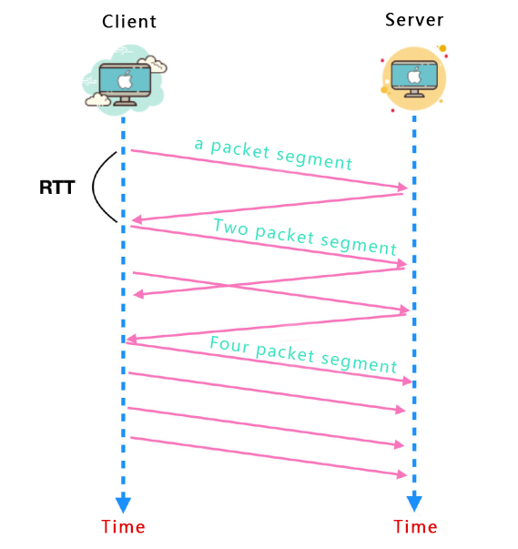 In the slow-start process, the value of the congestion window cwnd will be initialized to 1 MSS, and each time the transmitted packet segment is acknowledged, the value of cwnd will be increased by one MSS, that is, the value of cwnd will become 2 MSS. After that, the value of cwnd is doubled for each successful transmission of a packet segment, and so on. The specific growth process is shown in the following figure.