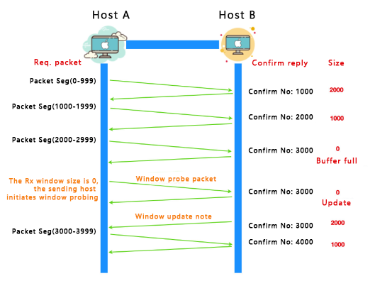 The sender host will periodically send a window probe packet, which is used to detect whether the receiver host is still able to accept data. When the receiver's buffer is in danger of overflowing, the window size is set to a smaller value to instruct the sender to control the amount of data sent.